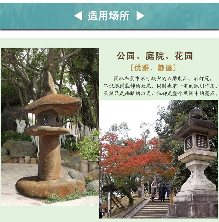 石燈籠是日本石文化的重要內(nèi)容之一,也是近年來(lái)我國(guó)出口日本石制品的一個(gè)重要品種。石燈籠在日本有著非常悠久的歷史。在佛前獻(xiàn)燈火是佛教的重要禮儀之一,自奈良時(shí)代 (公元 710~ 794年 )起日本在修建寺院時(shí)就開(kāi)始在寺院的正面建造石燈籠以保護(hù)向寺院所獻(xiàn)的燈火。日本現(xiàn)存的最古老的石燈籠是奈良時(shí)代的當(dāng)麻寺石燈籠,距今已有一千多年的歷史了。到了江戶時(shí)代 (公元 1603~ 1867年 )石燈籠在日本已廣為流傳,一些寺院里造型精美的石燈籠被作為樣本模仿雕刻以至形成了石燈籠的各種形式。石燈籠被用于園林、庭院的裝飾始于十六世紀(jì)晚期的安土桃山時(shí)代,當(dāng)時(shí)由于茶道的大發(fā)展,石燈籠常被作為茶室的一種露天裝飾物而廣泛進(jìn)入庭院裝飾。隨著石燈籠用途的改變,石燈籠的樣式也就更加多樣化了,例如出現(xiàn)了三腳或四腳的雪見(jiàn)燈籠,同時(shí)對(duì)竿和笠的部分也給予新的設(shè)計(jì),石燈籠的式樣由模仿進(jìn)入創(chuàng)新。現(xiàn)在日本的石燈籠除了少量用于寺院神社以外,大多數(shù)的石燈籠是用于庭院、園林裝飾使用。