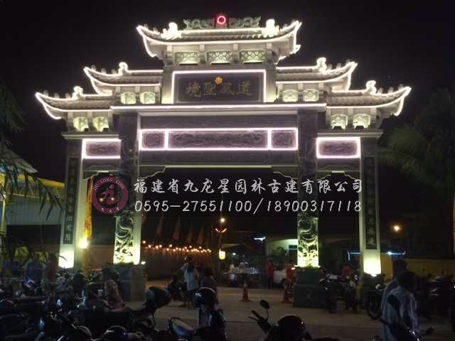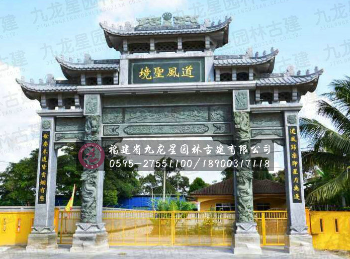石雕牌坊的造型大氣美觀,結(jié)構(gòu)合理勻稱,周身雕刻著各種吉祥圖案,代表著我國(guó)的傳統(tǒng)文化,各種吉祥物也反映出人們對(duì)于美好生活的向往。石雕牌坊按照開門數(shù)一般可分為三門、五門、七門。草白玉、青石、漢白玉以及花崗巖這些石材成為制作石雕牌坊的主要石材。牌坊周身布滿浮雕圖 案,雕刻工藝精美細(xì)膩。常見的瑞獸圖案有龍、鳳、麒麟、鹿(諧“祿”)、魚(諧“余”)等。另外有荷花、牡丹、松鶴、梅蘭竹菊代表著健康長(zhǎng)壽、平安幸福。 石雕牌坊頂部的結(jié)構(gòu)造型主要有坊式和樓式兩種,樓式結(jié)構(gòu)的頂部結(jié)構(gòu)復(fù)雜,斗拱以及樓瓦的配合使得整體氣勢(shì)恢宏。