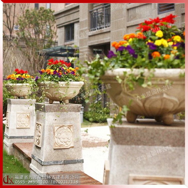福建石材花缽批發-九龍星園林古建。石材花缽靈活多樣,隨處可用,尤其對于城鄉建筑比較密集和其他一些難于綠化地區的美化,有著特殊的意義。石材花缽的擺放可根據缽、盆樣式、大小的不同,進行多種多樣的藝術組合。組合的形式可以是幾何式、自然式、混合式、集中布置、散置等,具體布局形式可根據要美化地點的情況決定。在較寬敞的地方,如廠前區、廣場、大型建筑門前、道路交叉口、停車場等處,石材花缽可布置為樣式多變、五彩繽紛的小花壇,在商店、住宅的門前亦可隨機點綴一二。